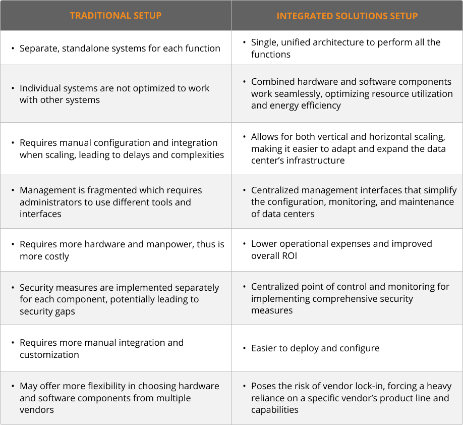 Define your data center’s budget constraints and objectives clearly so you can find a solution that balances performance, scalability, and affordability. Consider both the upfront costs and the long-term total cost of ownership. While integrated solutions may have a higher initial investment, they often lead to cost savings in terms of operational expenses and resource optimization.